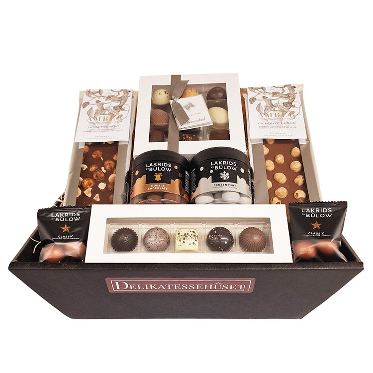Julekurv - stor gavekurv med lækkert fra Summerbird, Lakrids by Bülow og Xocolatl